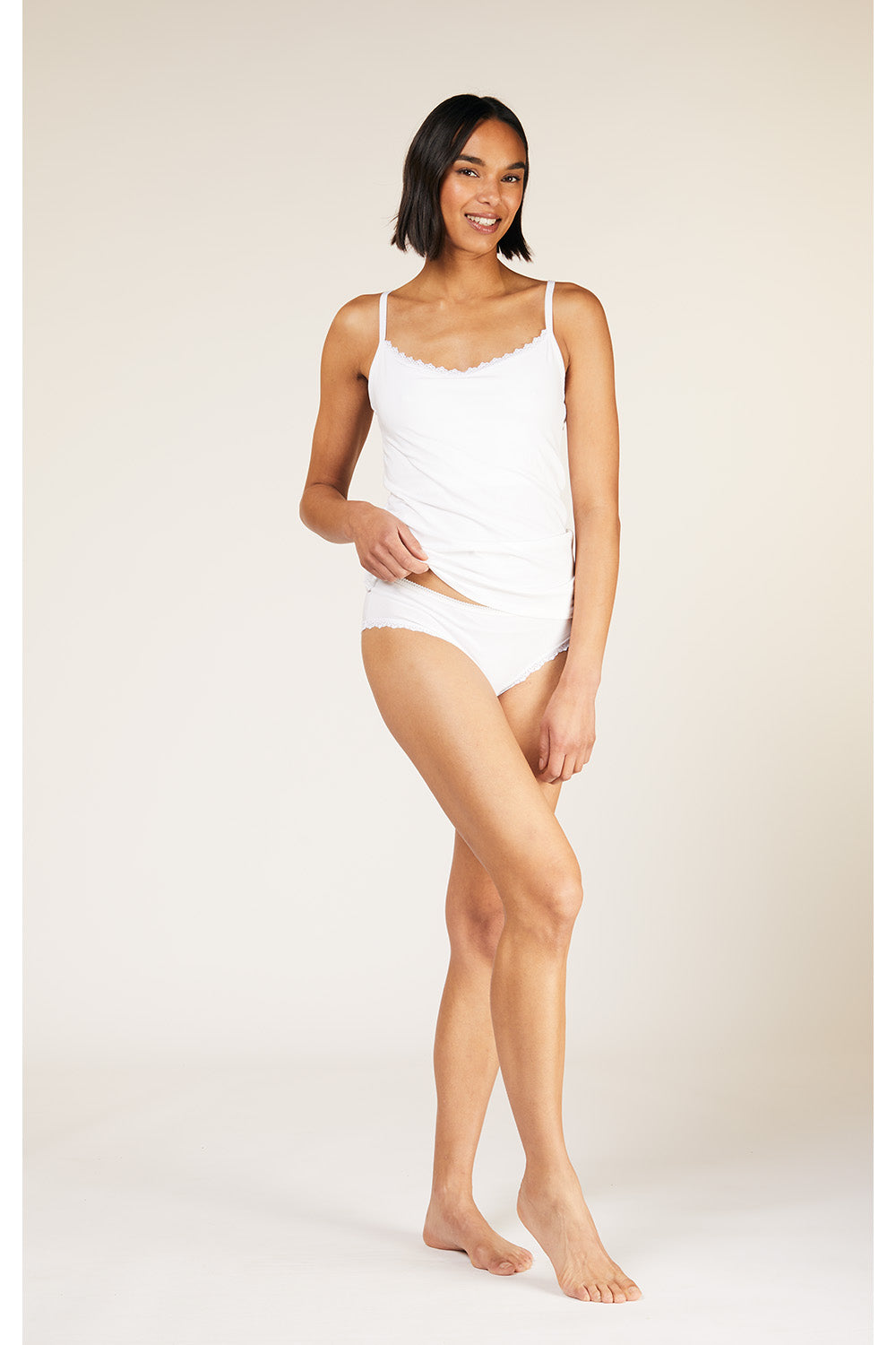 Camisole top with a comfortable hidden support panel made from a luxuriously soft organic cotton in stretch jersey finish for a close fit. A flattering style which tapers in at the waist and features adjustable straps. Core staple to add to your capsule wardrobe which can be worn as loungewear, nightwear or as a breathable base layer in the colder months. We especially love the feminine lace trim across the neckline.