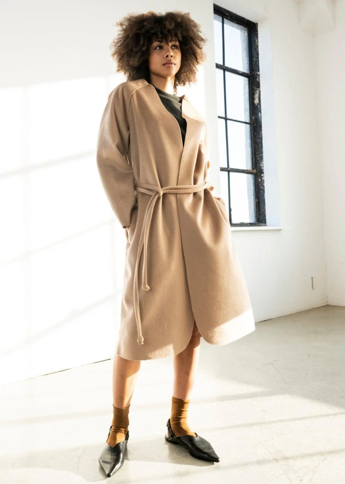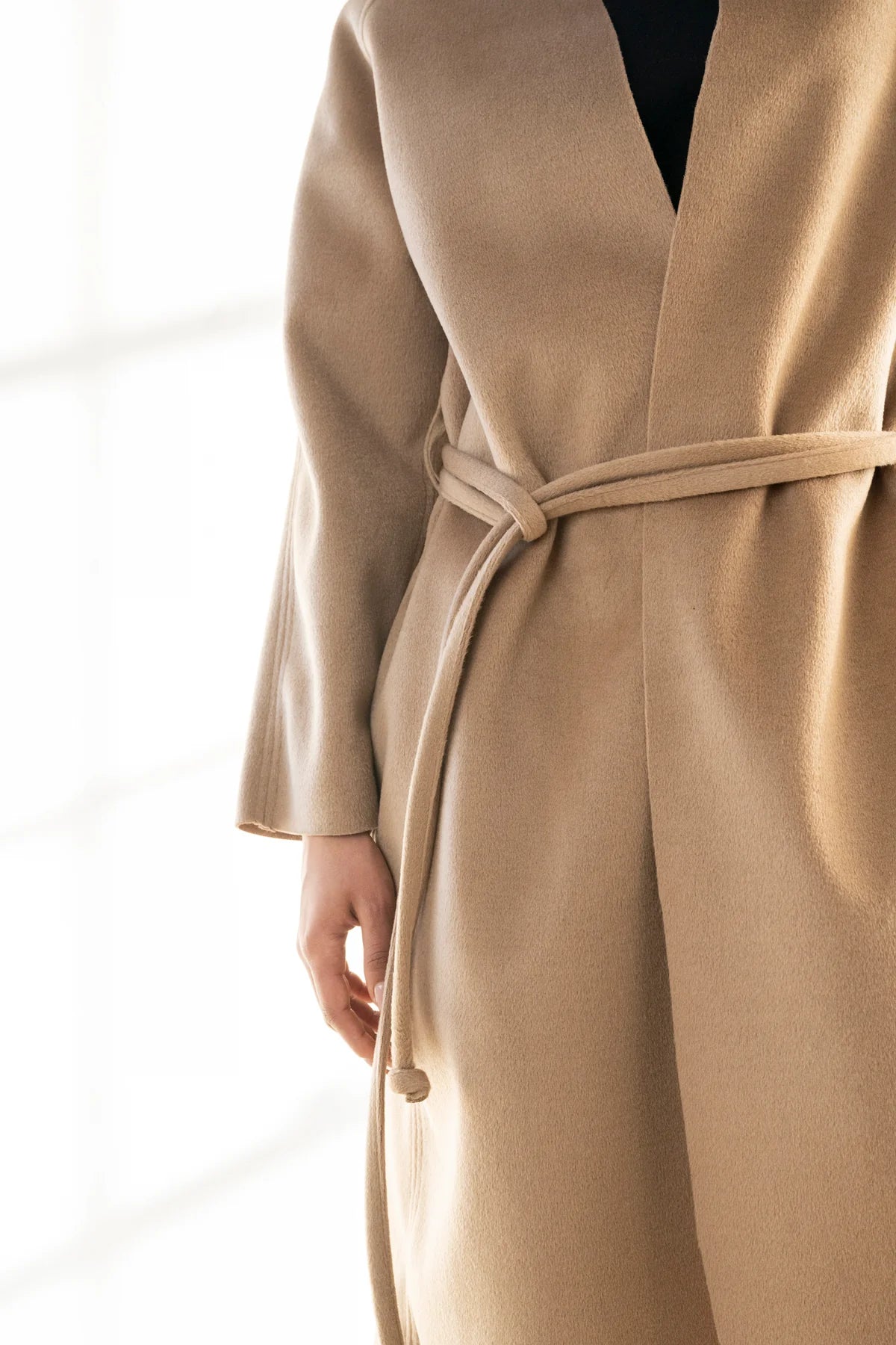 This camel Inverness Jacket is designed with raglan sleeves, a raw edge finish, and a mid-calf length. It also includes a round patch pockets on the front and a fabric belt for a stylish and functional touch.