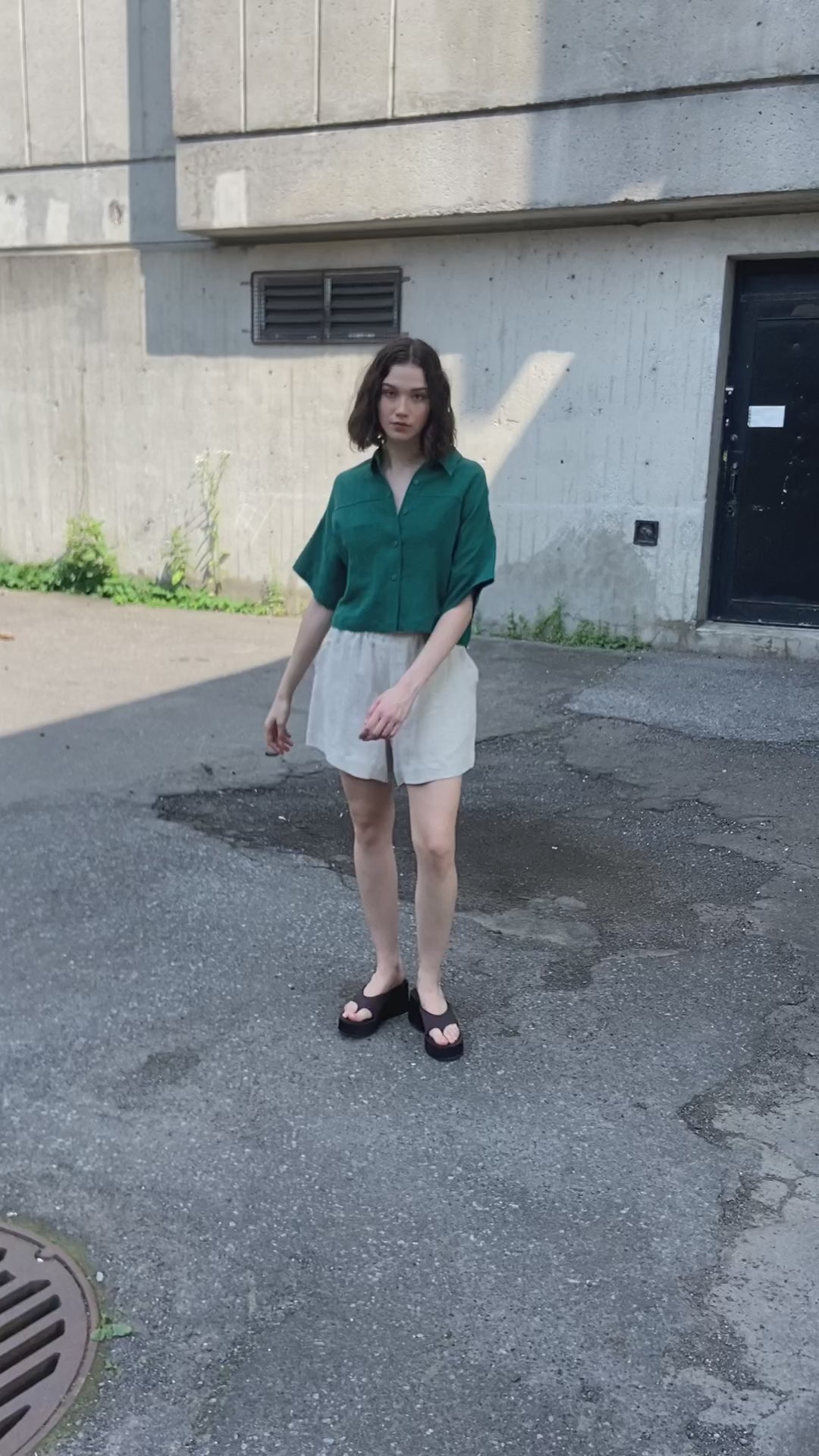 Super fun boxy cropped shirt that captures Eve Gravel's signature aesthetic with oversized, three-quarter-length sleeves and modern minimalist appeal. The Tara Shirt in Emerald features a classic collar, discreet button placket, and a functional chest pocket on the right. This vibrant emerald hue adds a fresh pop of colour to your Kelowna wardrobe. A timeless fit crafted from breathable linen that you'll reach for season after season throughout the Okanagan.