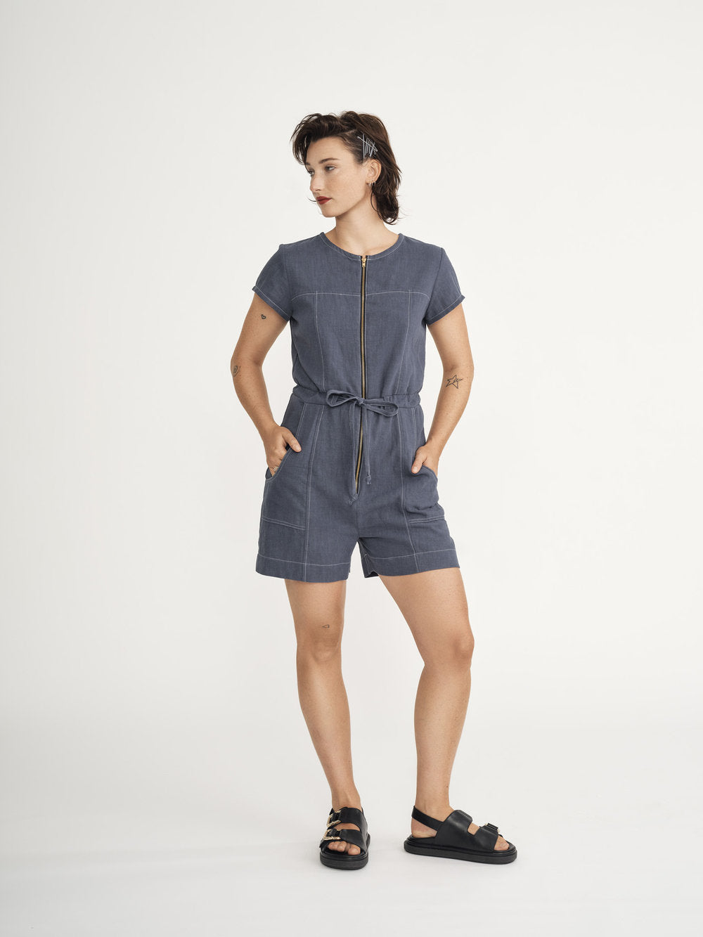 The Sun is a joyful romper with adjustable waist tie and short sleeves. The white top stitching gives it a retro feel. The brass front zipper adds a “workwear” feel. It has patch pockets and sweet style lines.