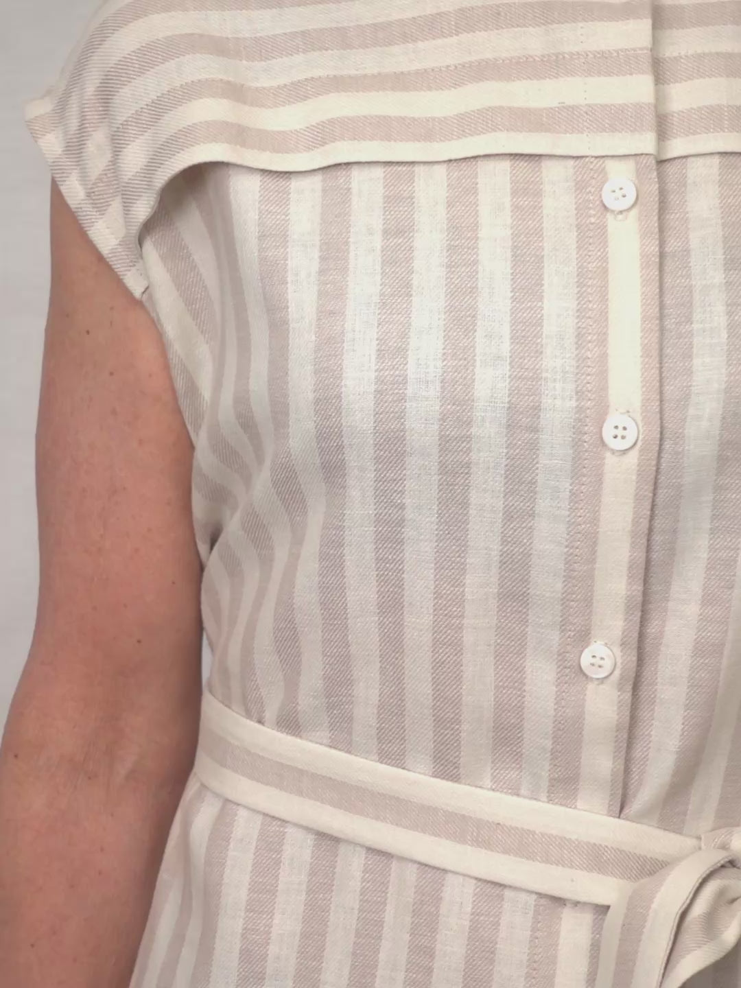 A summery linen tunic, the Wren can be worn with its matching belt or not! Wear it open over pants or closed as a dress. The front and back yoke details set it aside from other tunics with its playful stripes. It has side pockets and a mandarin style collar.